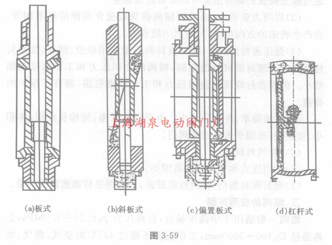 蝶閥根據(jù)連接方式分為:法蘭式、對(duì)夾式,如圖3—58(a)和(b)所示;根據(jù)密封面材料分為:軟密封、硬密封;根據(jù)蝶板在閥體中的安裝方式,蝶閥可分成:板式、斜板式、偏置板式、杠桿式。如圖3-59所示。
